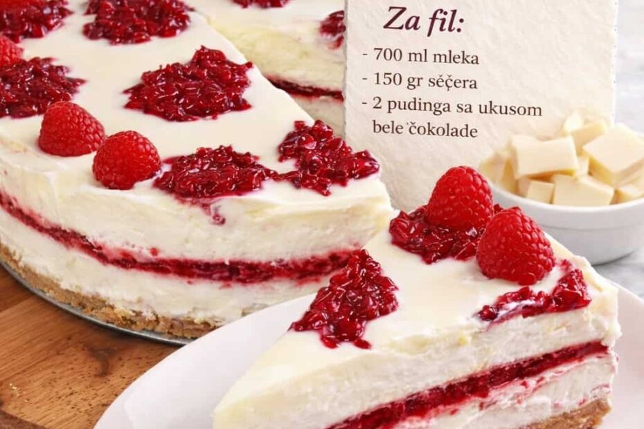 Kombinacija kremaste bijele čokolade i osvježavajućih malina daje savršen balans okusa. Lagana, elegantna i idealna za svaku priliku. Sastojci Kora 300 g mljevenog keksa 1 vanilin šećer 120 g putera (otopljenog) 120 ml mlijeka Bijeli…