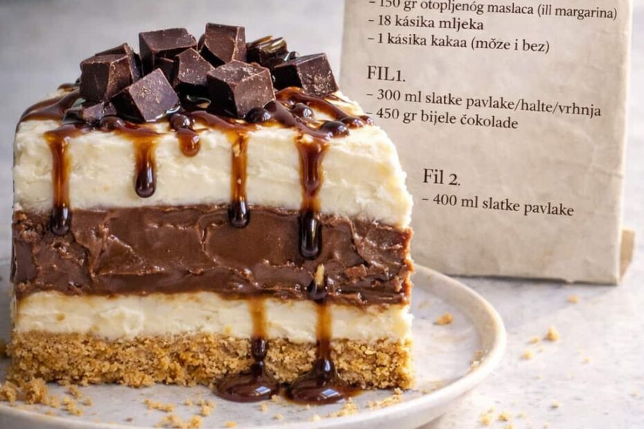 Kremasta, bogata i jednostavna torta sa dva čokoladna sloja – bijelim i tamnim. Savršena kad vam treba brz, ali efektan desert. Sastojci Kora 300 g mljevenog keksa 150 g otopljenog maslaca (ili margarina) 18 kašika…