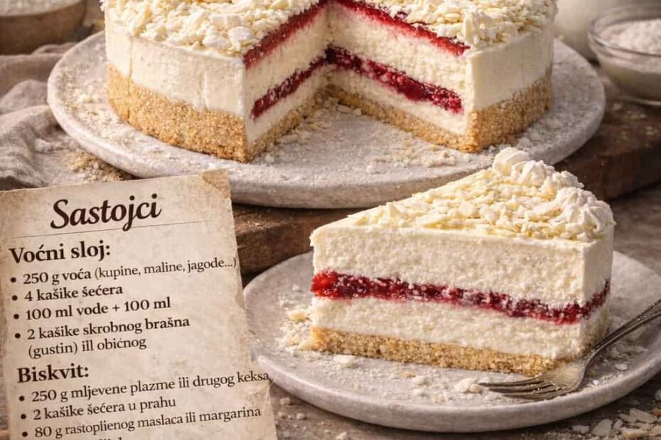 Savršeno lagana i osvježavajuća torta – kombinacija voća, kokosa i bijele čokolade daje desert koji izgleda i ima okus kao iz poslastičarnice. 📝 Sastojci Voćni sloj 250 g voća (maline, jagode, kupine…) 4 kašike šećera…
