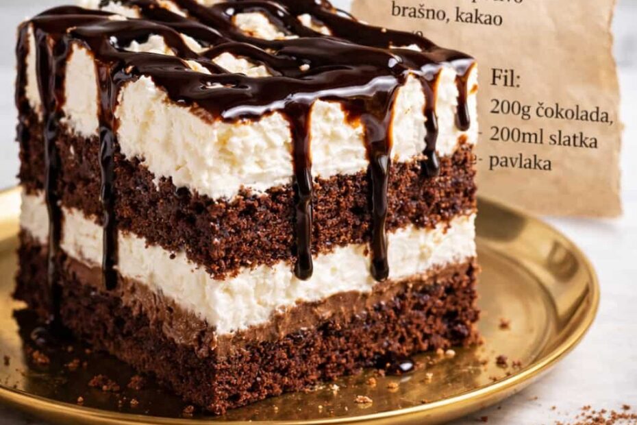 Sočne čokoladne kocke sa dva kremasta fila – tamnim i bijelim. Mekan biskvit i bogati filovi čine ih pravim hitom za svaku priliku. 📝 Sastojci Biskvit (kore) 4 jaja 70 g šećera 1 vanilin šećer…