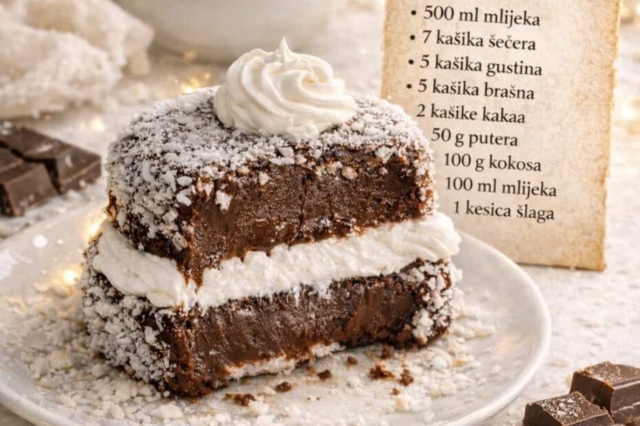 sastojci 500 ml mlijeka 7 kašika šećera 5 kašika gustina 5 kašika brašna 2 kašike kakaa 50 g putera 100 g kokosa 100 ml mlijeka 1 kesica šlaga priprema od mlijeka, šećera, gustina, brašna i…