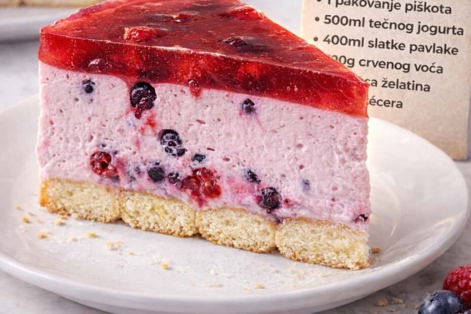 Sastojci: Za podlogu: 1 pakovanje piškota 100 ml mlijeka Za kremu: 500 ml tečnog jogurta 400 ml slatke pavlake 150 g šećera 1 kesica želatina 200 g crvenog voća Za preljev: 100 g crvenog voća…