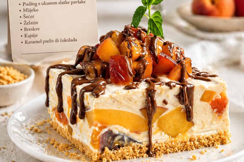 Sastojci Za podlogu: 180 g mljevenog keksa 2 kašike meda 4 kašike rastopljenog putera Za krem: 350 ml gustog jogurta 250 ml slatke pavlake 1 puding s ukusom slatke pavlake 500 ml mlijeka 4 kašike…