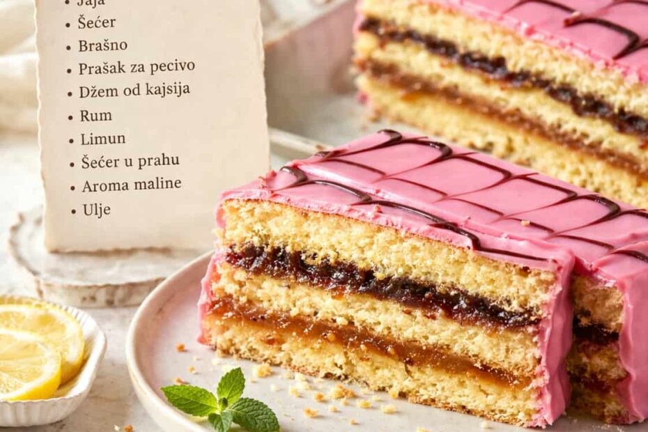 Sastojci Kore: 13 jaja 13 kašika šećera 13 kašika brašna 1 prašak za pecivo Fil: džem od kajsija 200 ml ruma 200 ml vode 200 g šećera 1 limun Glazura: 200 g šećera u prahu…