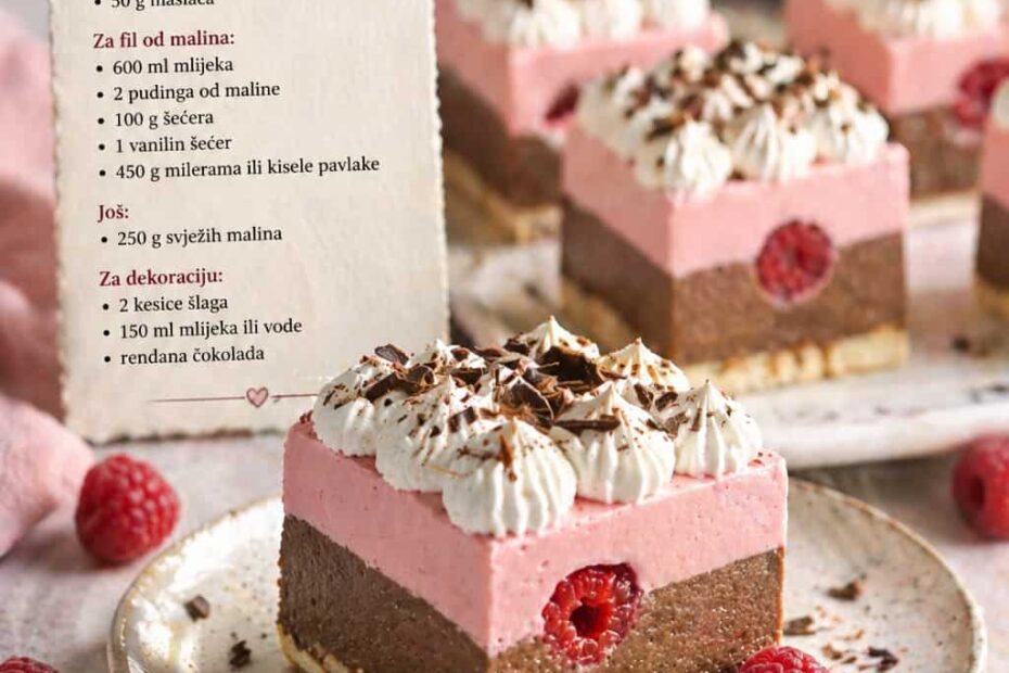 Sastojci 600 g petit beurre keksa 1 kg malina 10 kašika šećera 3 kesice pudinga od maline 2 dl vode 400 g čokolade 500 g šlag kreme u prahu 2 dl soka od narandže Priprema…