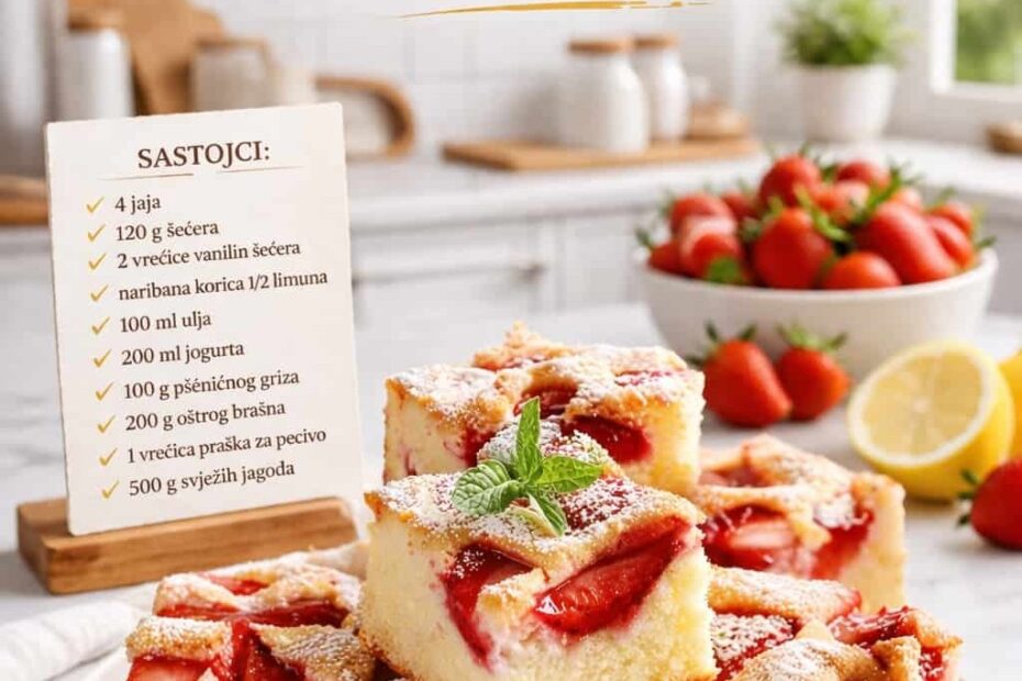 Sastojci: 🔻 Za biskvit: 4 jaja prstohvat soli 120 g šećera 2 vrećice vanilin šećera naribana korica 1/2 limuna 100 ml ulja 200 ml jogurta 100 g pšeničnog griza 200 g oštrog brašna 1 vrećica…