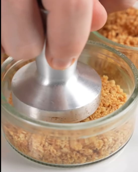Smjesu rasporedite na dno čaša ili malih posudica i dobro pritisnite kašikom da formirate čvrstu podlogu. Stavite u frižider dok pripremate kremu.