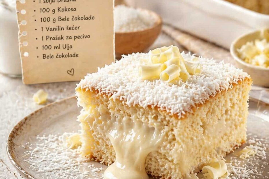 📝 Sastojci: 3 jaja 1 šolja šećera 1 vanilin šećer 1 šolja jogurta 100 ml ulja 1 šolja brašna 1 prašak za pecivo 100 g kokosa 100 g bijele čokolade Za završni sloj: još malo…