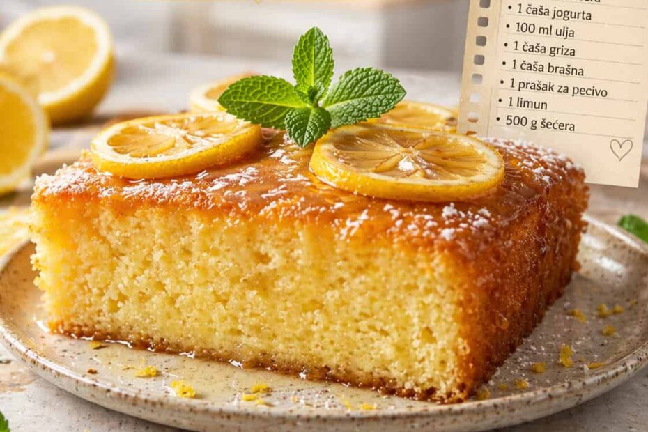 📝 Sastojci: Mjera: 1 čaša = 200 ml Za biskvit: 4 jaja 1/2 čaše šećera 1 čaša jogurta 100 ml ulja 1 čaša griza 1 čaša brašna 1 prašak za pecivo 1 limun Za agdu:…