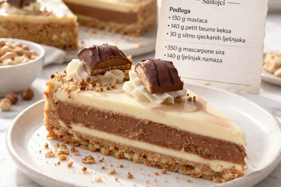 ⏱ Vrijeme pripreme Priprema: 20–25 minuta Hlađenje: najmanje 6 sati, najbolje preko noći Porcije: 12 🧾 Sastojci Podloga 130 g maslaca 140 g petit beurre keksa 30 g sitno sjeckanih lješnjaka Krema 350 g mascarpone…