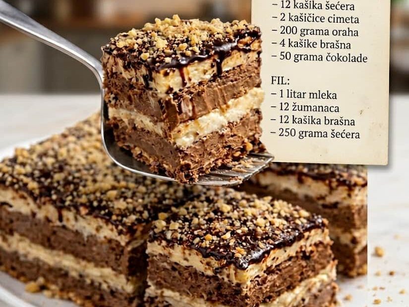 Sastojci Za biskvit 12 belanaca 12 kašika šećera 2 kašičice cimeta 200 g oraha 4 kašike brašna 50 g čokolade Za fil 1 litar mleka 12 žumanaca 12 kašika brašna 250 g šećera 2 vanilin…