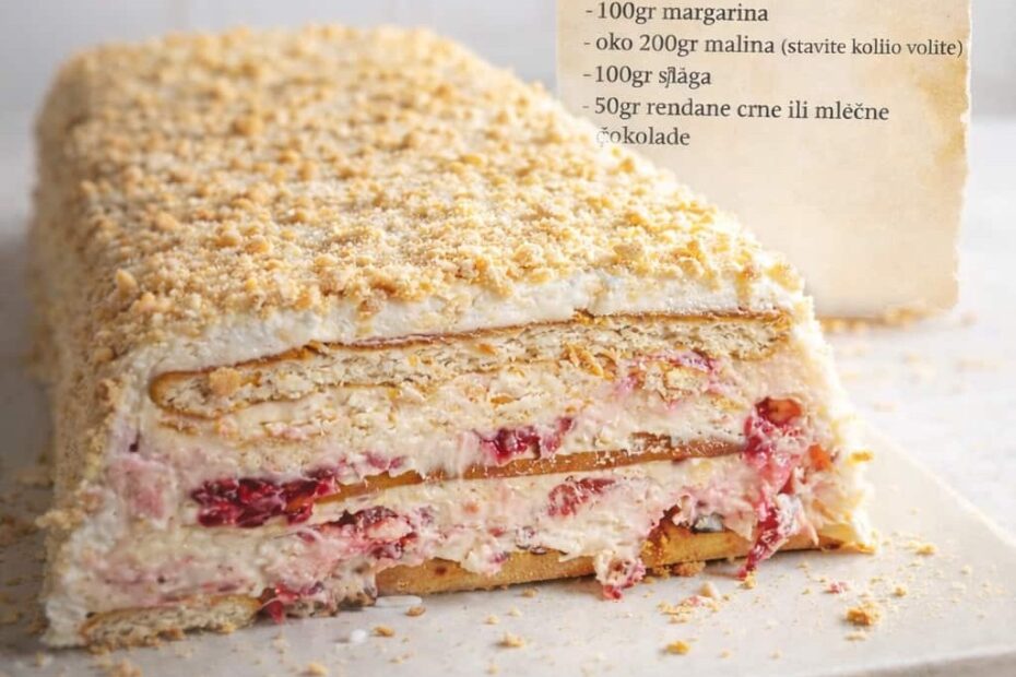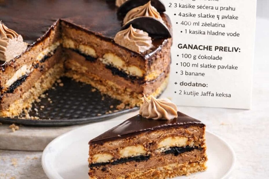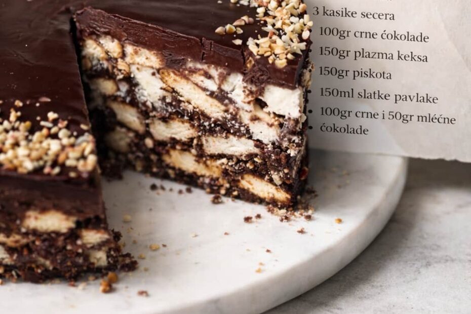 Potrebni sastojci: – 250ml mleka – 2 kasike gustina – 2 kasike kakaa – 3 kasike secera – 100gr crne cokolade – 150gr plazma keksa – 150gr piskota – 150ml slatke pavlake – 100gr crne…