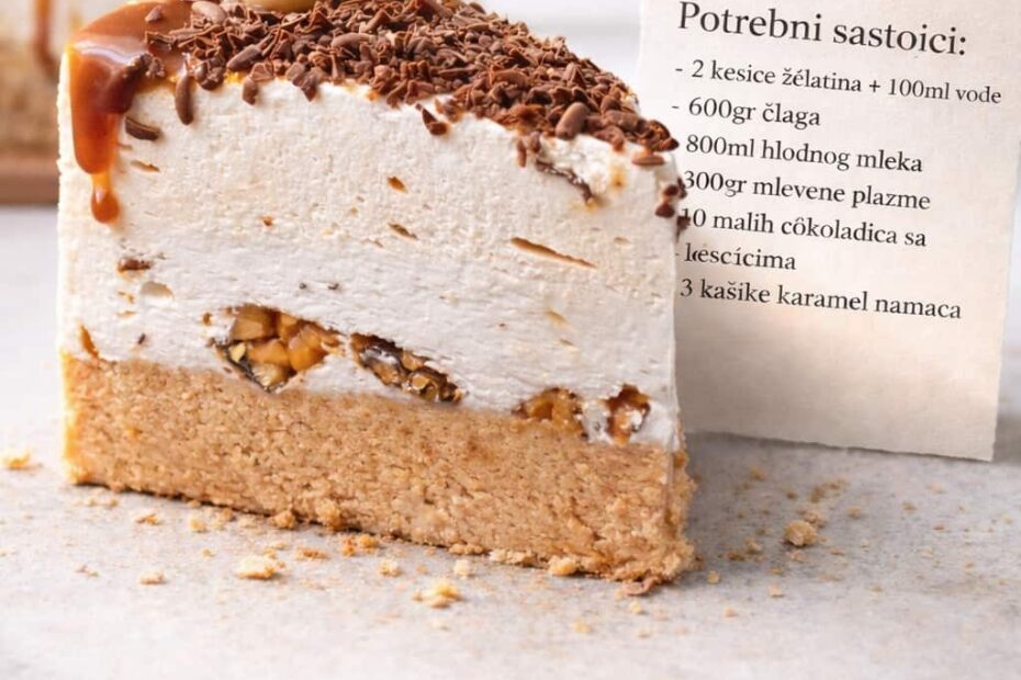 Potrebni sastojci: 2 kesice želatina + 100 ml vode 600 g šlaga 800 ml hladnog mlijeka 300 g mljevene plazme 10 malih čokoladica s lješnjacima (ili Snickers) 3 kašike karamel namaza Priprema: Želatin prelijte vodom…