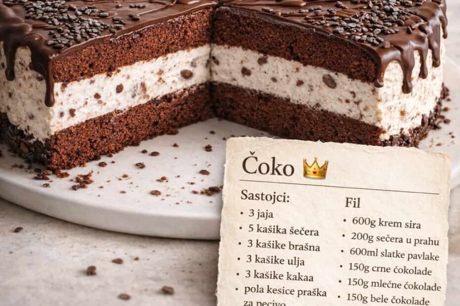 Sastojci: 🔻 Kora: 3 jaja 5 kašika šećera 3 kašike brašna 3 kašike ulja 3 kašike kakaa ½ kesice praška za pecivo par kašika čokoladnog mlijeka 🔻 Fil: 600 g krem sira 200 g šećera…