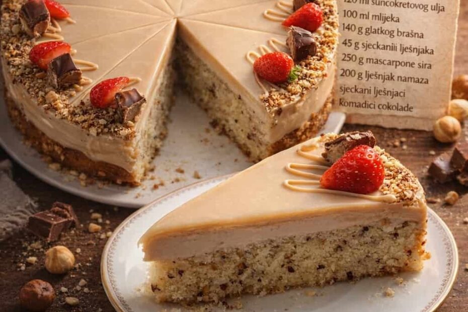 Sastojci: 🔻 Biskvit: 3 jaja 115 g kristal šećera 16 g vanilin šećera 120 ml suncokretovog ulja 100 ml mlijeka 140 g glatkog brašna 5 g praška za pecivo 45 g sjeckanih lješnjaka prstohvat soli…
