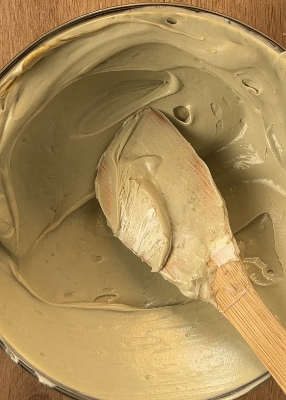 - U velikoj posudi za miješanje lagano pomiješajte maskarpone sir sobne temperature s namazom od pistacija. Koristite špatulu i miješajte dok ne dobijete glatku, homogenu smjesu bez tragova.