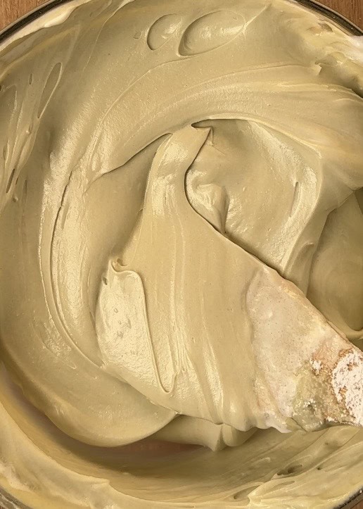 6. Neposredno prije serviranja, prekrijte cijeli vrh obilnim slojem namaza od pistacija, ravnomjerno ga raspoređujući od ruba do ruba.