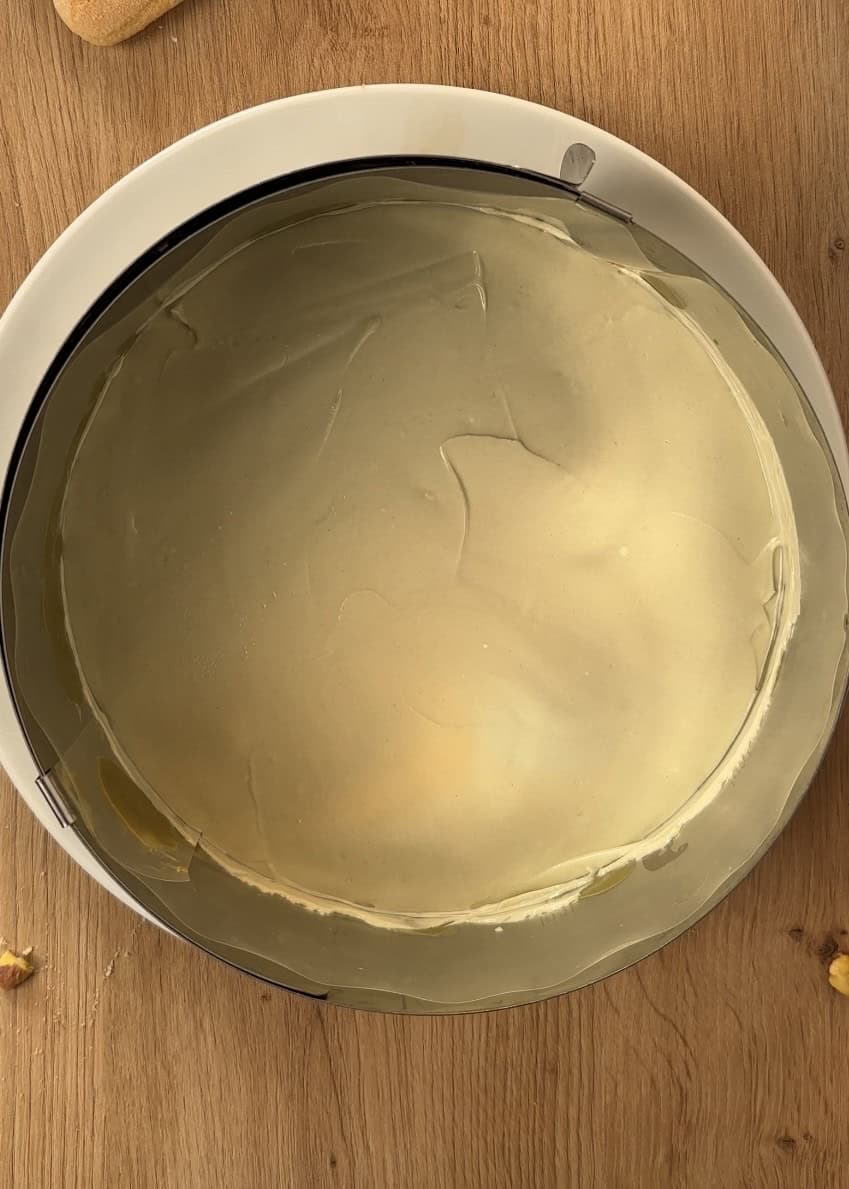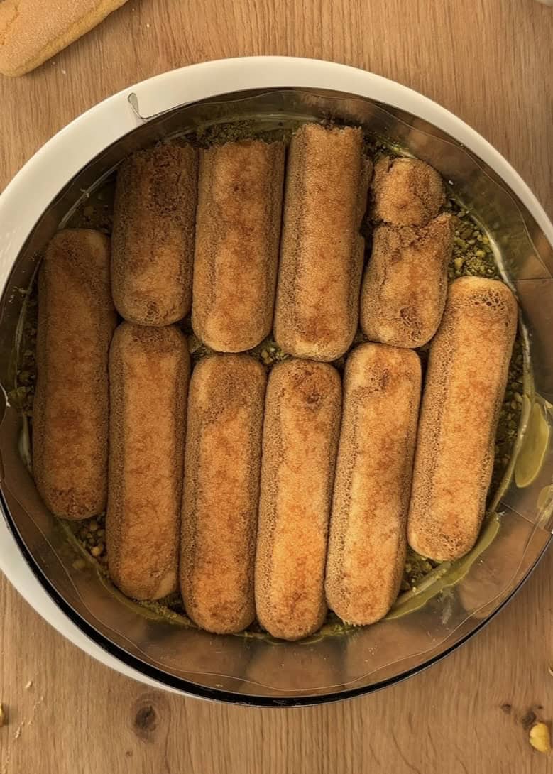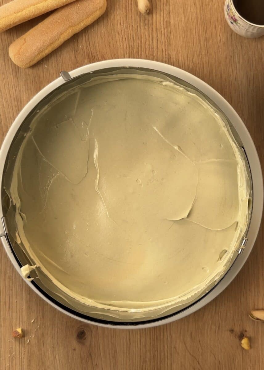 - Ravnomjerno rasporedite polovinu kreme od pistacija i maskarponea preko piškota.