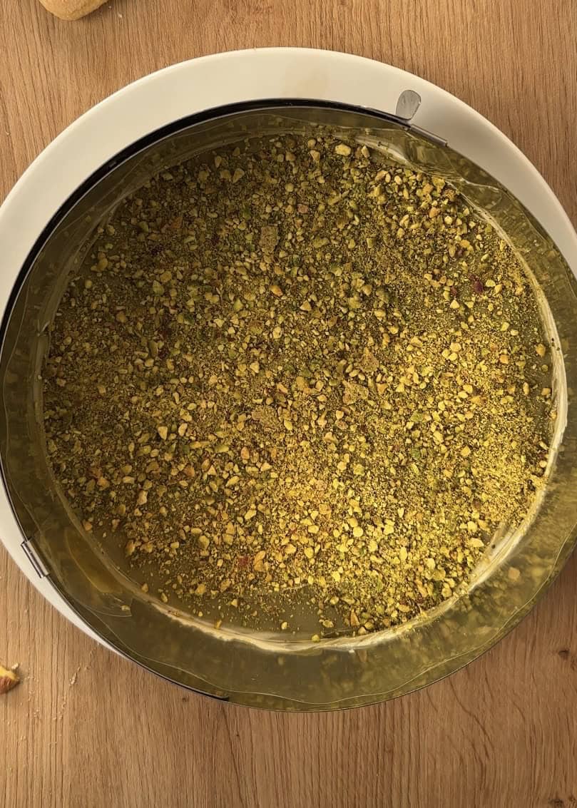 - Neposredno prije serviranja, otopite malo pistacija i dodajte ga preko vrha, obavezno ga premažite po cijelom vrhu, izvadite iz kalupa s odvojivim dnom i poslužite.