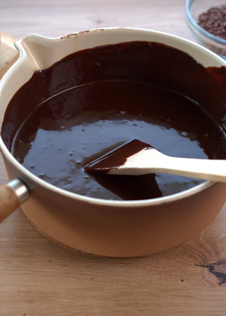 U veliku tavu od lijevanog željeza dodajte gusto slatko vrhnje za mućenje i zagrijavajte ga na srednjoj vatri dok ne počne ključati. Kada proključa, isključite štednjak i ulijte čokoladu. *Sitno nasjeckanje čokolade će olakšati ovaj korak!). Ostavite čokoladu u vrhnju netaknutu 5 minuta. Nakon 5 minuta, miješajte dok se potpuno ne otopi. Sačuvajte ganaš prekriven plastičnom folijom.